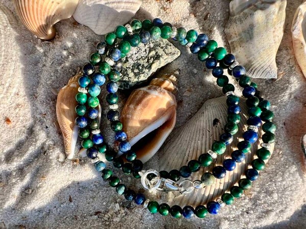Azurit Malachit 4mm polierte Kugeln, mit Silber Verschluss und kleinen Silber 925 Perlen, kann dreifach gewickelt als Armband oder offen als Halskette getragen werden