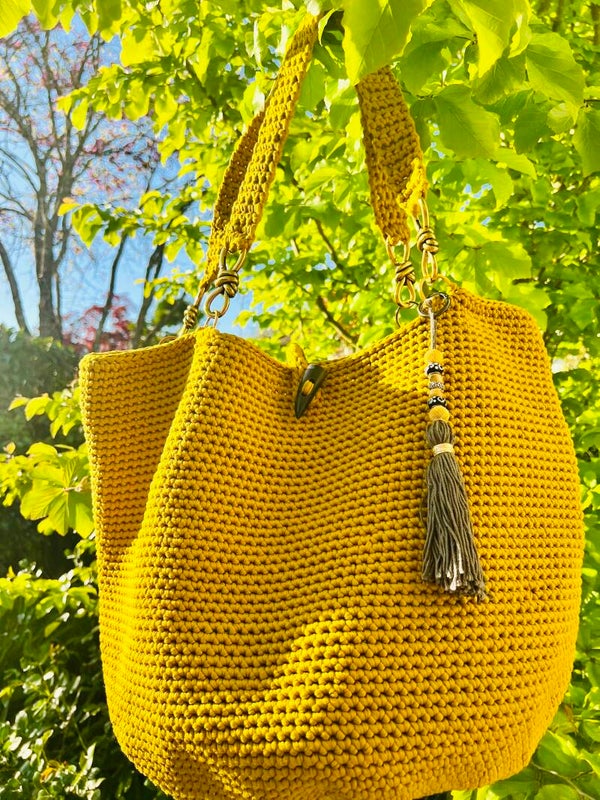 Aus Garn gehäckelt, Farbe Curry/senf, mit Anhänger.